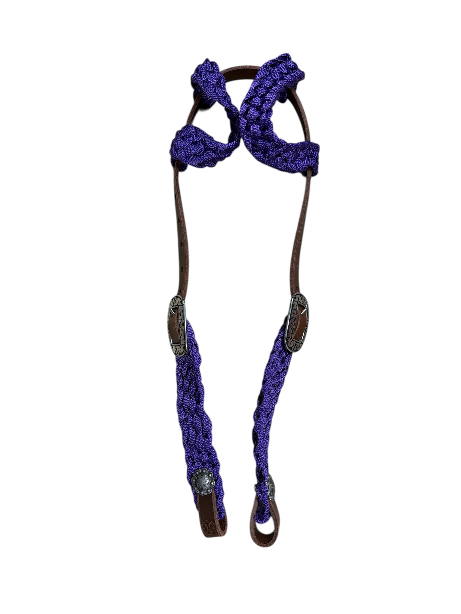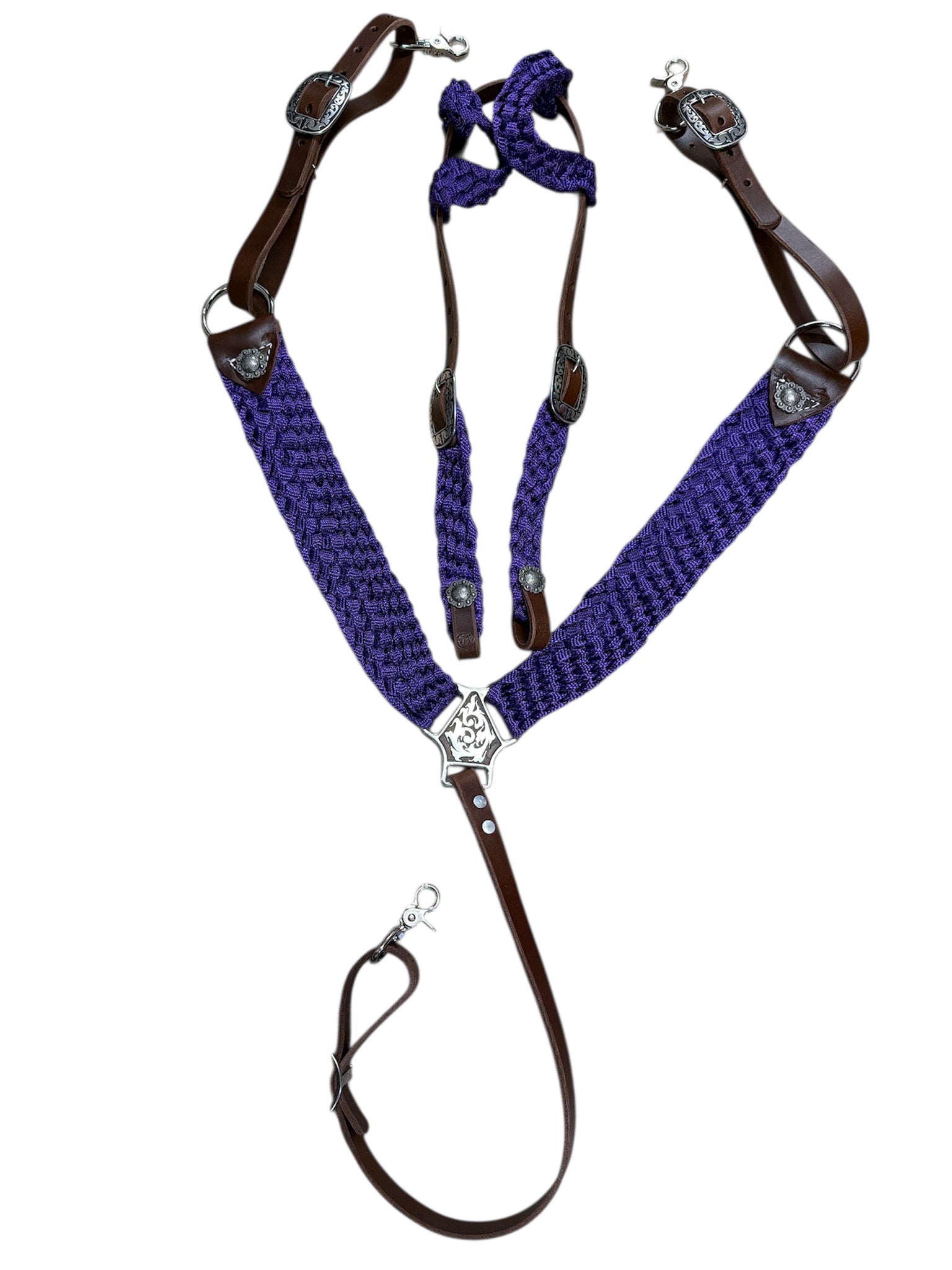 Beautiful braided mule tape breast collar with leather tugs. It is made from mule tape with a bridle leather leather and stainless steel Jeremiah Watt buckles