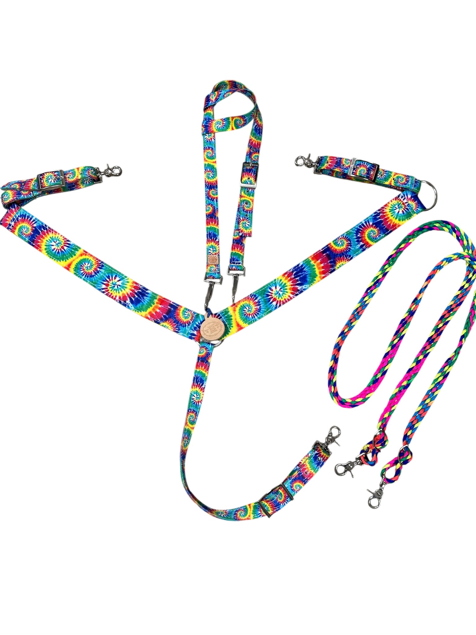 This is an average horse breast collar that is made from a tie dye nylon print. It takes up on the side very simply with roller buckles. I have attached trigger snaps to the sides and the bottom tugs to make it easy attach.