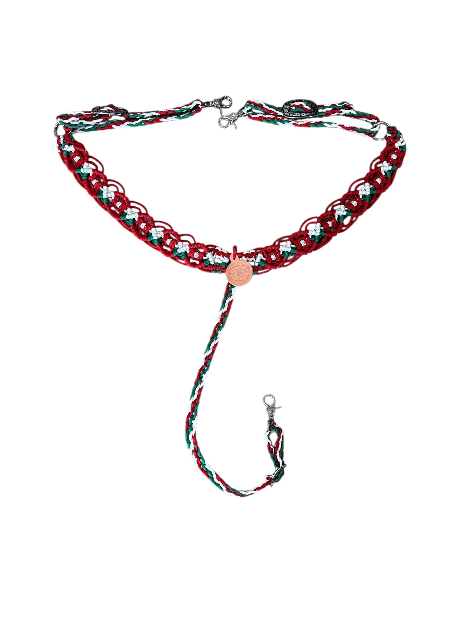 This is a  breast collar that is hand braided out of the highest quality 550 paracord.  It is very  It takes up on the side very simply with roller buckles.  I have attached trigger snaps to the sides and the bottom tugs to make it easy attach.