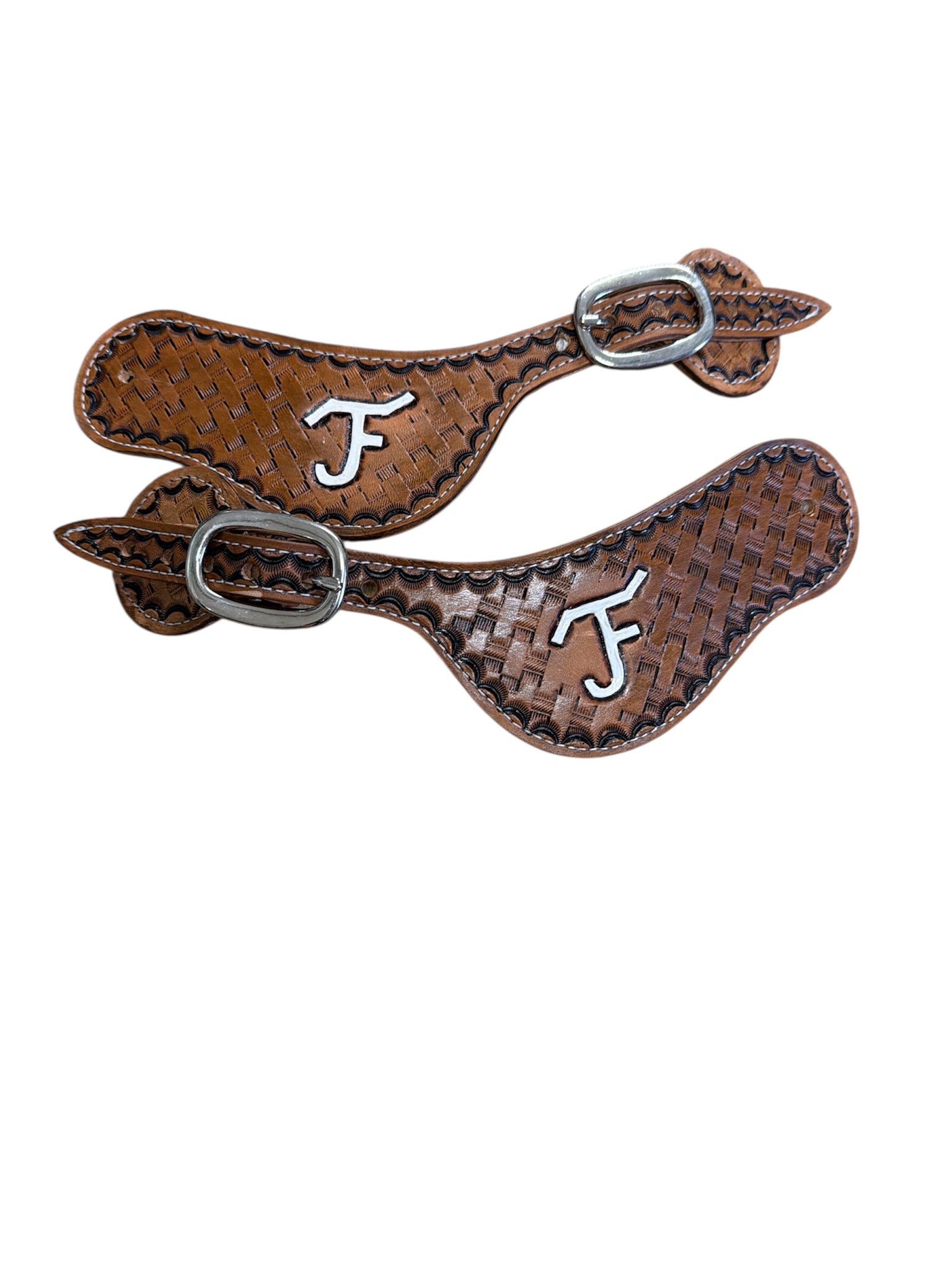 Hand tooled and painted Custom Brand spur straps basketweave.