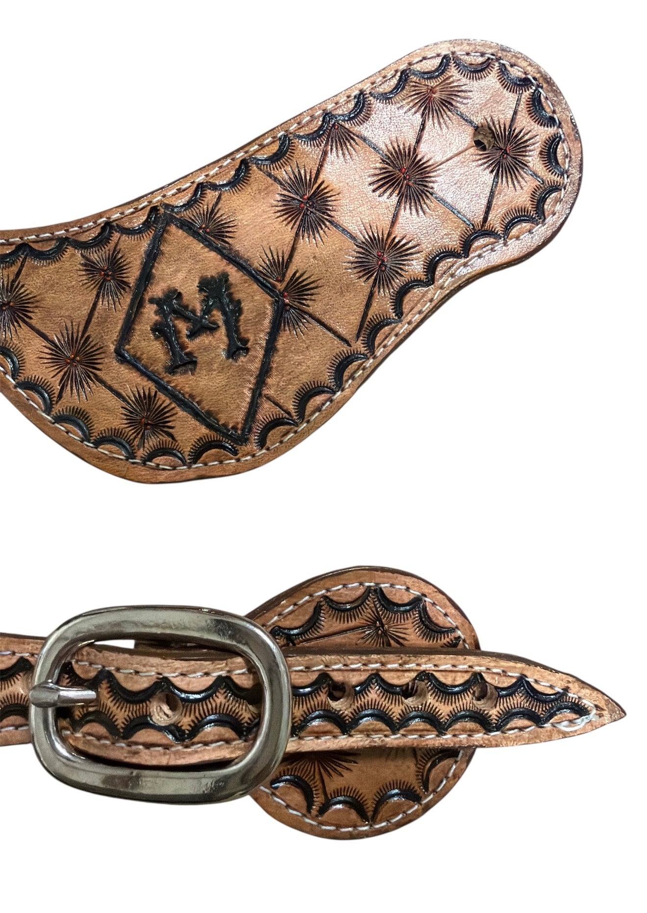 Beautiful tooled and painted leather spur straps.  Initials