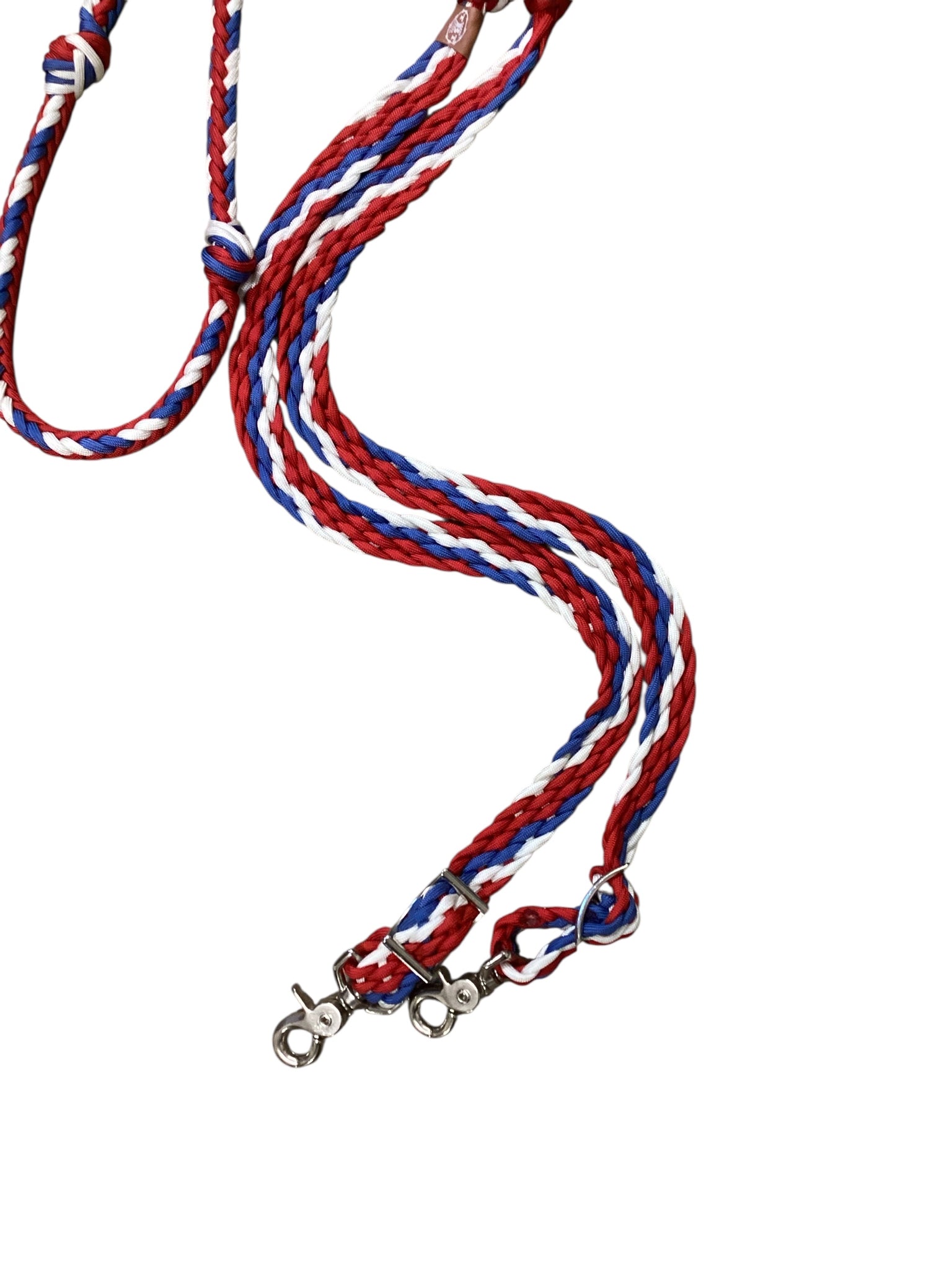 8 strands. .. Nice width and weight.  These are not too wide but they are wide enough and have a good weight.  You can choose the length and color of these  barrel reins.  You can adjust them shorter and they have grip knots to help with your turn.