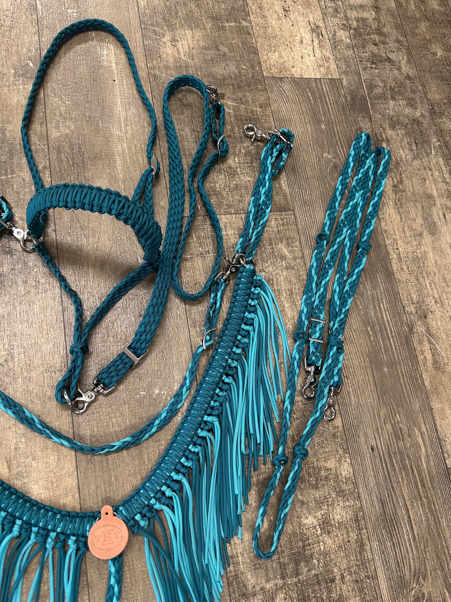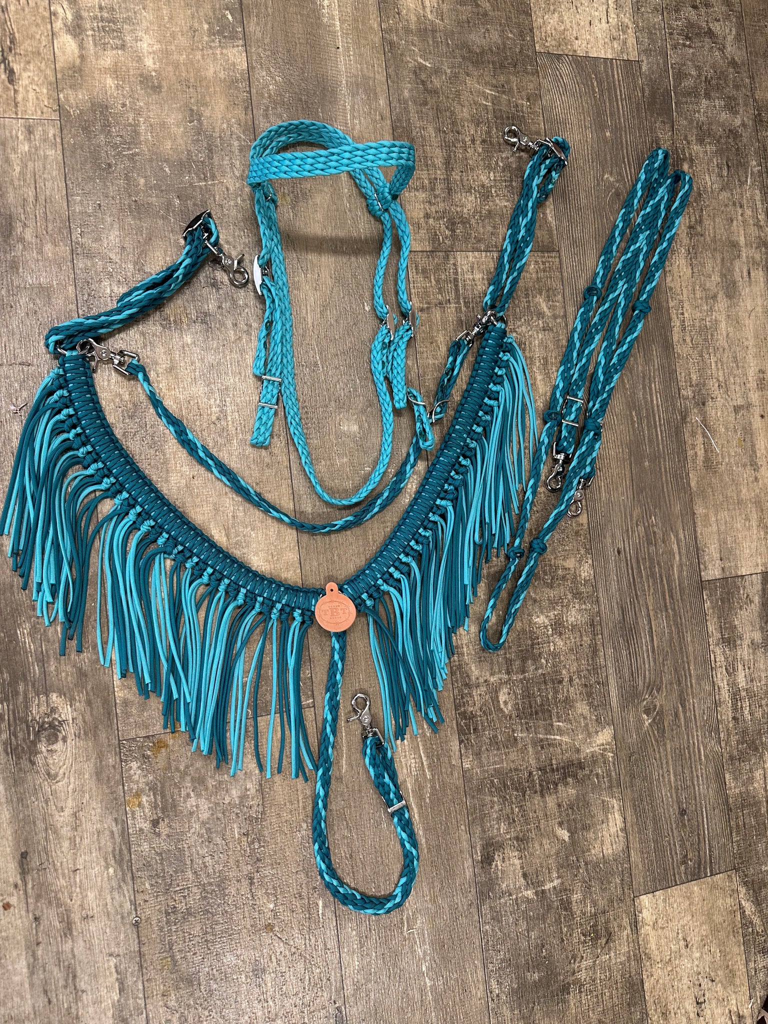 This is a full horse tack set in teal and turquoise.